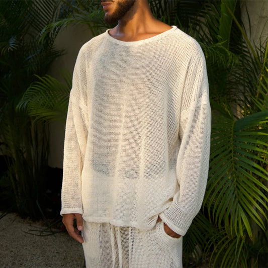 Breathable Mesh Long Sleeve T-Shirt: Solid Color Vintage Crew Neck for Men