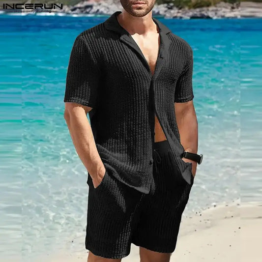 Summer Casual Knitwear: Men's Pure Color Short Sleeve Shirt and Shorts
