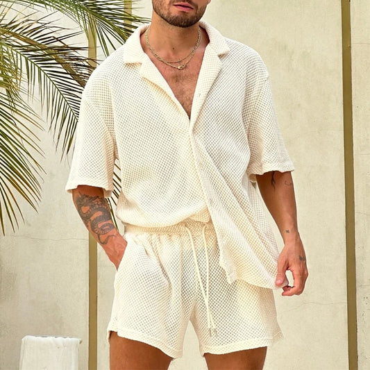 Casual Men's Fashion: Solid Color Transparent Shirt & Shorts Set